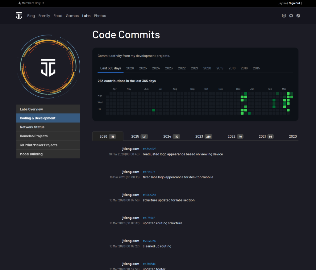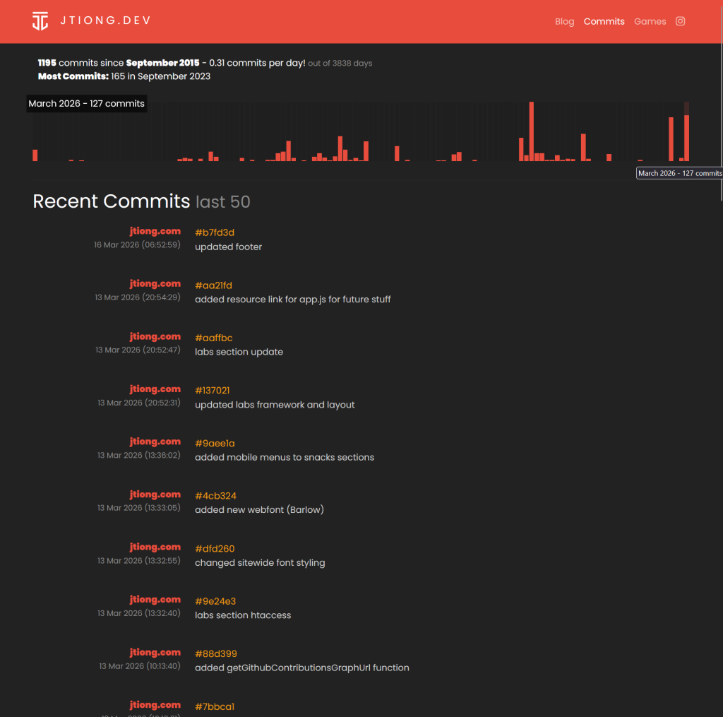 In the new design, I’ve taken more “inspiration” from Github (really it’s just straight up copied) using a tabbed layout to show my commits across the years, plus a slightly more unique “last 365 days commits” in the first tab to make it a bit more dynamic.