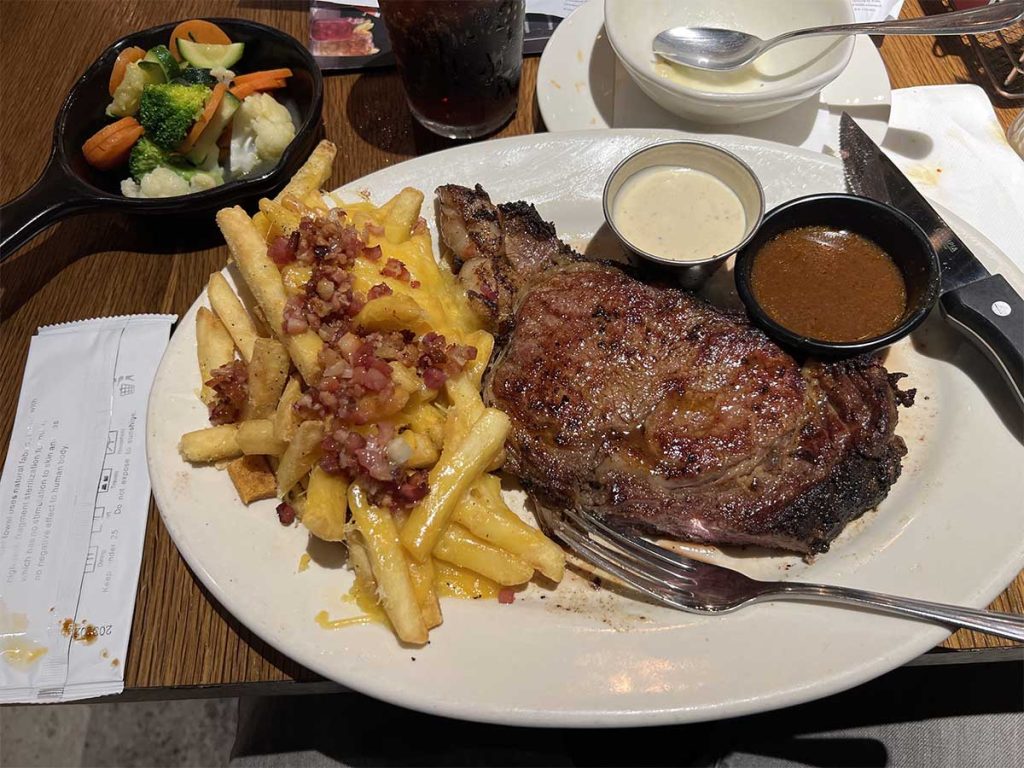 They left too much of the fat cap at the end on, one end of the steak was charred way more than the other end (the fatty end was undercooked) – making the fat render and drench everything in grease, but not in a nice hot way. The steak was left to rest too long so it was almost cold; and the chips had coagulated with their cheese to form a solid brick (you can see in the photo, this is about 60 seconds after the plate was put down in front of me).