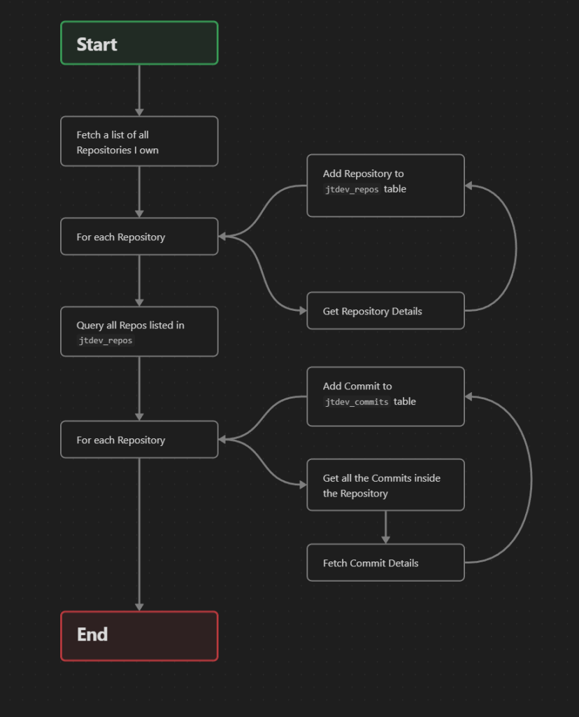 Just a couple of loops to go through Repos โ Commits is all I really need for my personal scale. Below is a very simplified diagram: